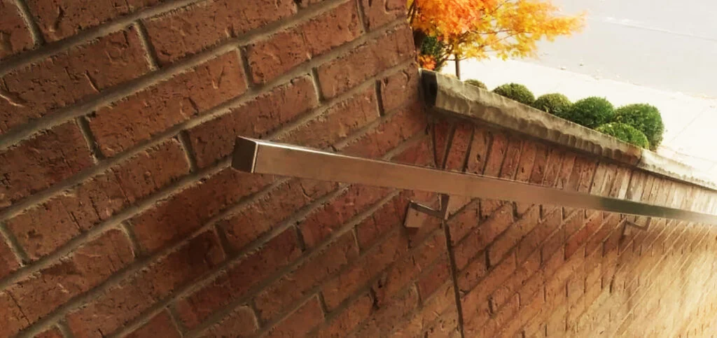 Tubing installed on steel supposed brackets mounted to brick, stone, concrete, or studs behind drywall. Keeps the glass guards clean with minimal hardware for the all-glass look.